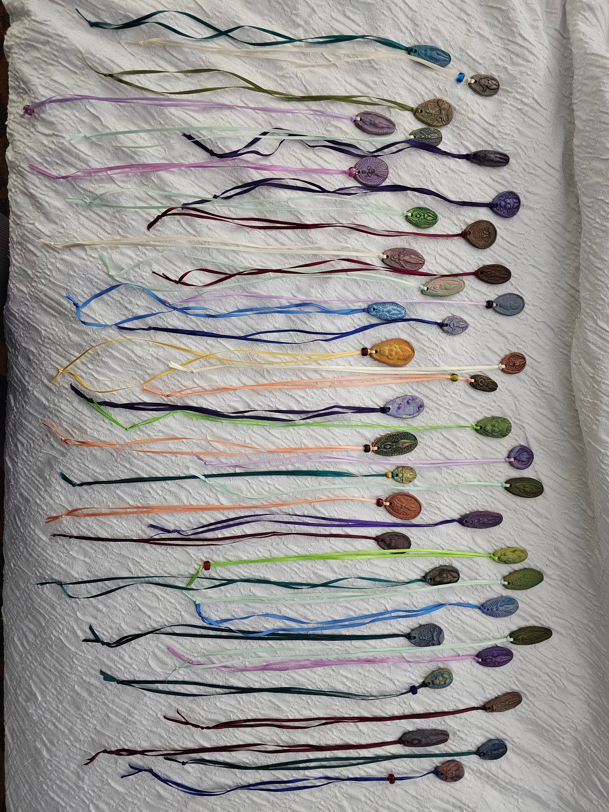 Embrace the mythos and mystery that surrounds midwives by buying one of our mystery medallions. The colors and designs are completely random, making these the perfect grab bags items and client gifts. Made of clay with ribbon cords these make great necklaces, bookmarks, car and bag badges.